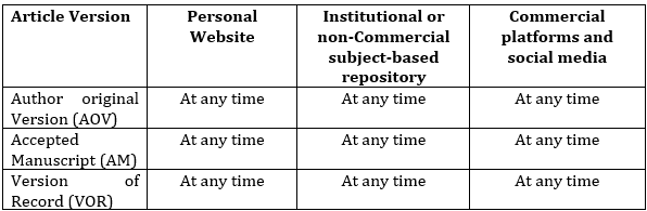 Ci-STEM Journal of Advanced Materials and Computing allow authors to deposit all versions of their work. This policy sets out the ways in which authors can self-archive versions of their work on their own web pages, on institutional webpages, and in another repository. Further explanation can be seen in the table below.